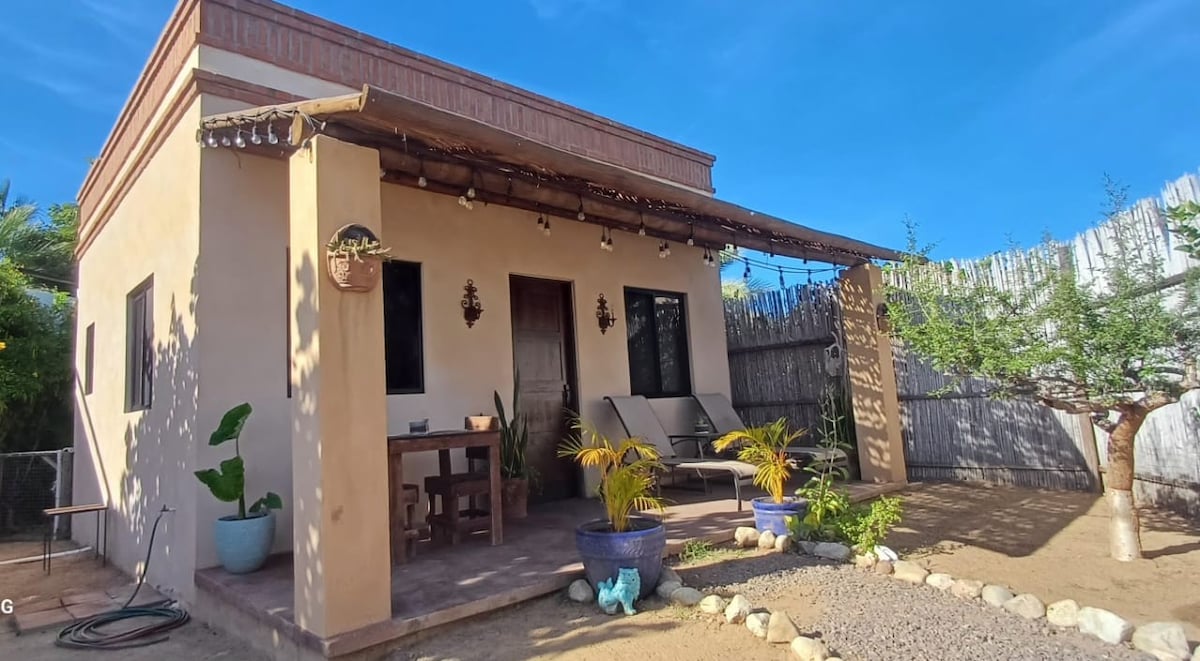 New private, cozy, safe casita with a small outdoor kitchen (best for LIGHT cooking)and high speed internet located in San Vicente neighborhood, 10-15 mins walking to downtown Todos Santos and 15 mins walking to La Poza beach. The casita shares the property with our eco-build main house. Bike from the casita to beautiful mountain biking trails or drive 10 mins to the surf /swim break at Cerritos. Happy to take you on rides or show you the trails!