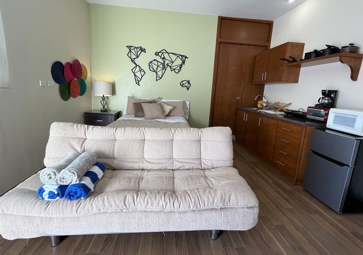 The apartment is new, modern and comfortable. It has an independent access. It's located 4 km away from "El Malecón" (downtown), in a very quiet and safe neighborhood. It has one full bed, one sofa-bed, a small kitchen that includes a mini-fridge and an electric stove, a table for four, a space for clothes-storage and a full bathroom. It has AC and good wifi signal. There's a patio with a hammock that guests can use, and parking space. There's a washer available for guests.