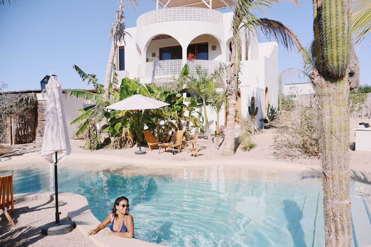 Click my profile to see all listings at Swell Todos Santos (4.96 Stars, 614 reviews) Inside you’ll find modern, airy spaces with lots of natural light and Starlink wifi. Outside you can relax in the hammock on your private rooftop balcony or kick back by the pool and gas fire pit. Our property is situated about a 7 minute walk from the beach, 1.5 miles/2.5km from downtown, and 0.6 miles/1km from a local market and a few restaurants.