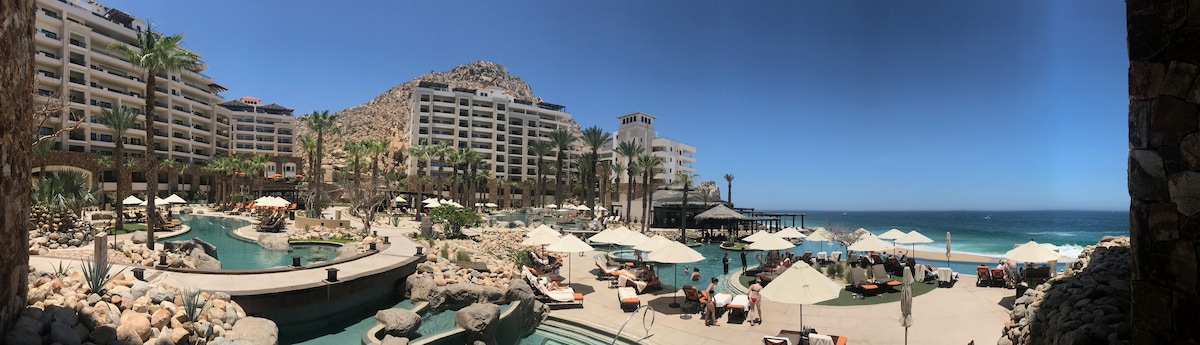 Beachfront Resort & Spa on swimmable, white sandy Medano Beach overlooking Lovers Arch! Villa #3408: Spacious, contemporary, 4th floor 2,295 SF with 2 Bedroom Suites, 3 full bathrooms, tub, large private terrace, A/C, Chef’s kitchen, Dining table, Living Room, TVs, wifi + Ocean, pool & courtyard views. Resort awards incl: 2024 Trip Advisor, Booking & Wine Spectator. See why Villa la Estancia & La Casona were rated one of the best hotels in the world by Trip Advisor's Traveler's Choice 2024!