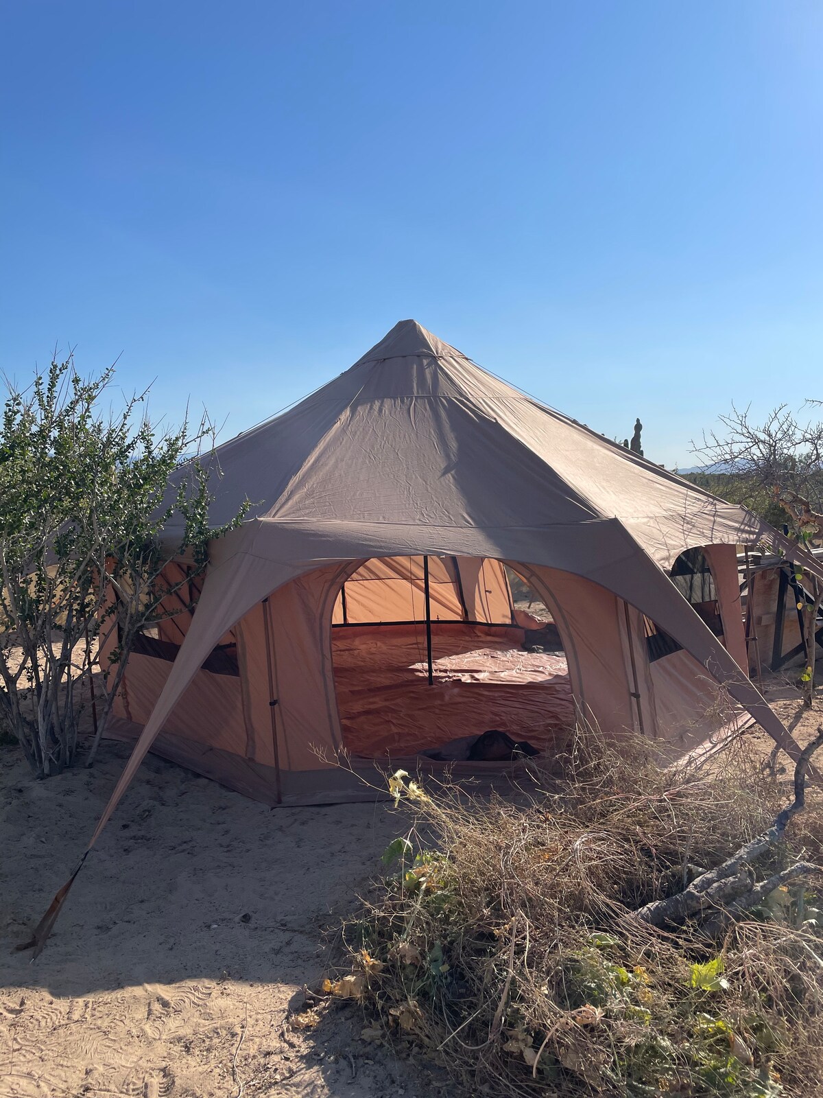 Imagina despertar en el corazón del desierto de Baja. Pasa la noche en una tienda de glamping con colchón matrimonial y baño privado al aire libre. Disfruta una ducha caliente bajo las estrellas, cocina en la cocina exterior o déjanos cocinar para ti! Trabaja rodeado de paz, cactus y silencio. No es solo un lugar para dormir, es un espacio para reconectar, respirar profundo y recordar lo simple y bello que es vivir. ¡Baja te espera!