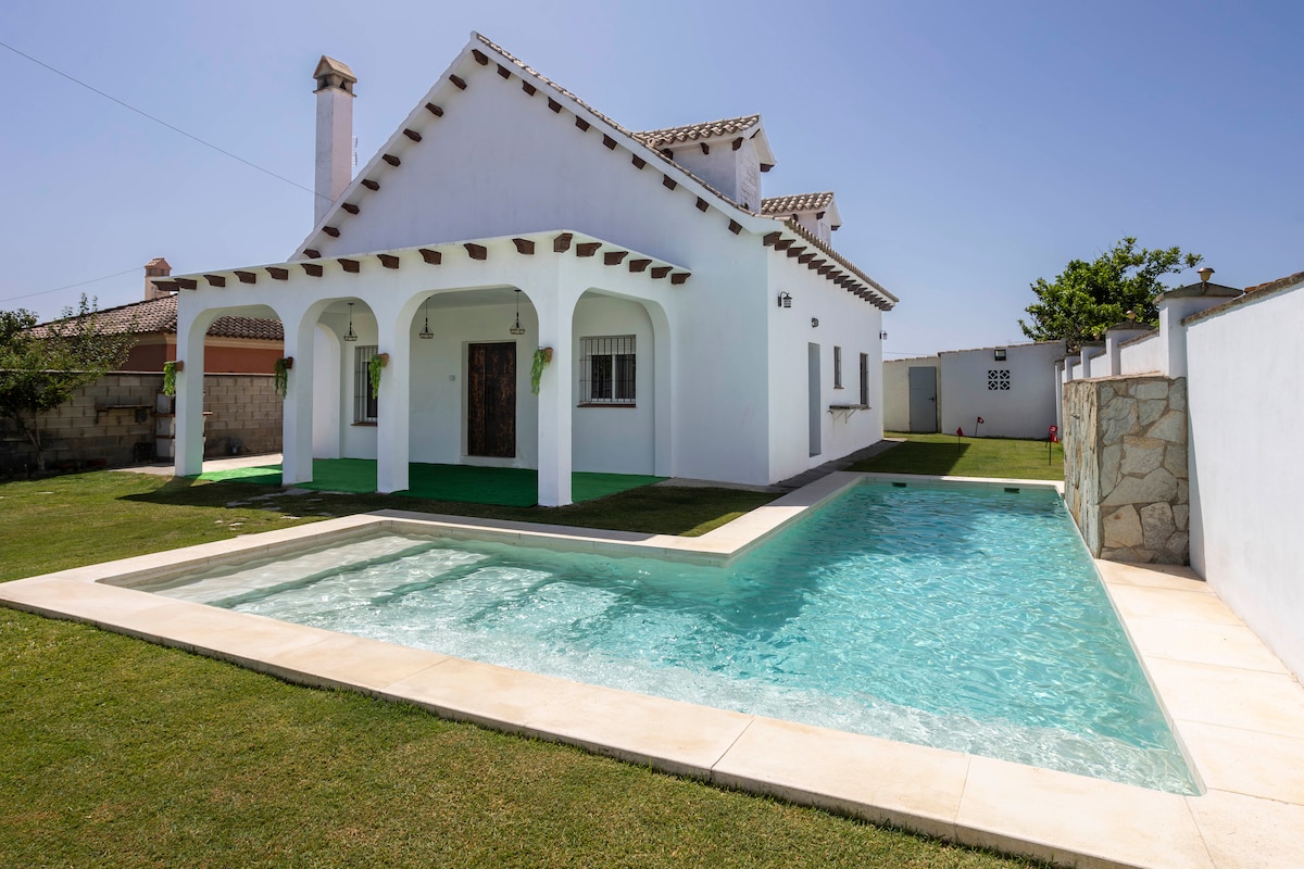 Excepcional villa individual en la playa de la Barrosa. Ubicación llena de luz, paz y tranquilidad y buenas sensaciones. Amplio jardín con piscina privada, barbacoa, 3 dormitorios, 2 baños, salón con chimenea, comedor, cocina, porche. Zona con todo tipo de servicios cercanos y fácil acceso, a 5 min.de la playa y 15 min del campo de golf de Sanctipetri, . Totalmente equipada para unas vacaciones perfectas. Si busca un lugar ideal esta preciosa casa, no le defraudará.