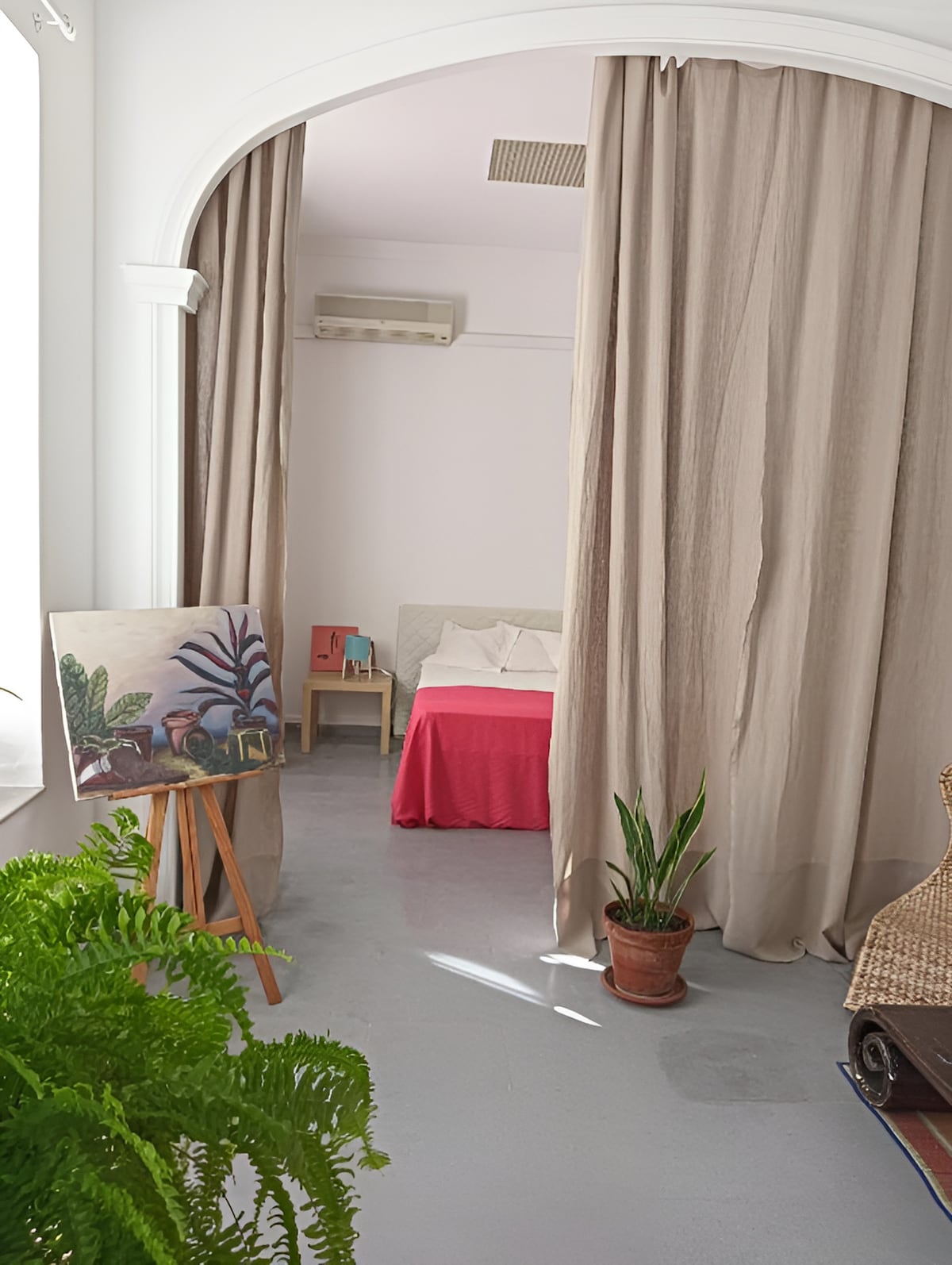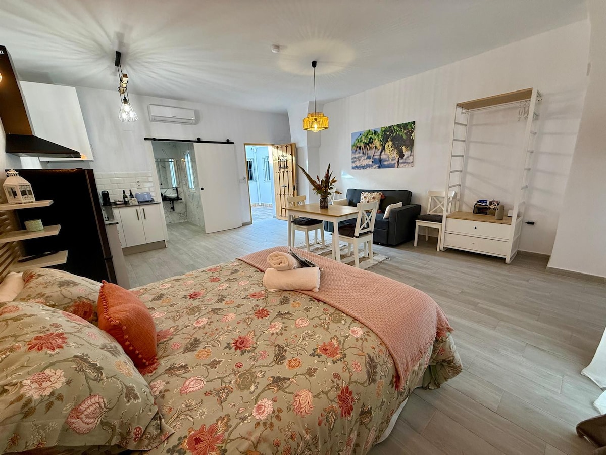 Disfruta de la sencillez y elegancia de este alojamiento tranquilo y céntrico. El apartamento ocupa parte de la planta baja de nuestra casa de huéspedes, tiene entrada directa desde el patio y disfruta de dos enormes ventanas, lo que lo hace muy luminoso todo el año. Se trata de un mini loft con una mini cocina, una zona de estar y dormitorio todo en uno. Dispone armarios, TV, baño privado, WIFI y por supuesto si lo deseas, puedes utilizar el patio de nuestra casa. No se hace limpieza diaria.