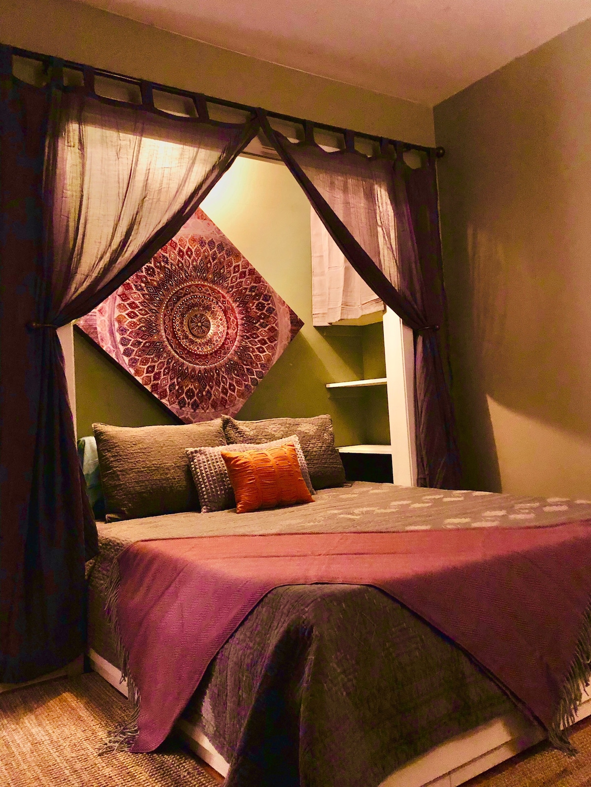 The perfect place to settle in and relax after a day of travel and activities. A private guest suite w/theater room vibe. side by side twin beds set on raised tier pallet platforms. Set up as pictured. Plenty of pillows, blankets & Smart TV for streaming. Enjoy the garden space right outside your door. Relax on the hammock or enjoy sitting on the swing by the small pond listening to the water fall. It's the perfect space to unwind.
