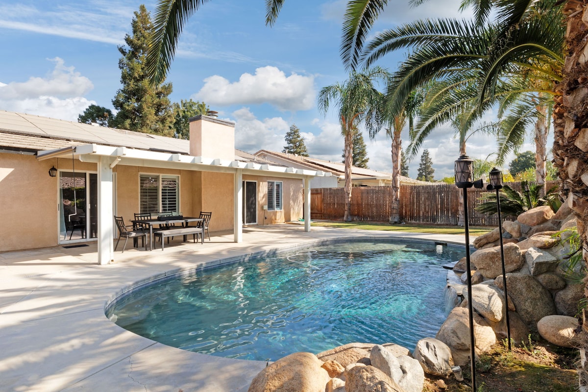 Experience elevated comfort in this elegant 4-bed, 2-bath home located in a quiet and safe Northwest Bakersfield neighborhood. Enjoy a beautiful backyard oasis with a sparkling pool, perfect for relaxing, entertaining, and creating unforgettable moments. The upscale game room features a classic arcade with 3000+ games, PS5, foosball table, and a stylish sofa bed, allowing it to serve as a fifth room. Close to fine dining, shopping and a Tesla EV charger for added convenience.
