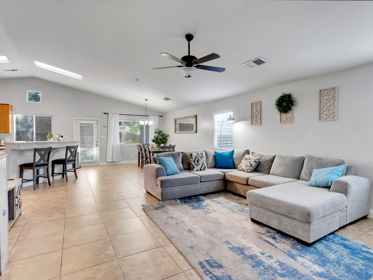 Spacious 3K sq ft 4 BD with 3 full bath in cul-de-sac at The Oaks, a highly sought neighborhood • 9 beds (king, queen, 3 full, 4 twin) • 2 large living rooms with top-of-the-line 75” and 65” QLED HDR TVs • 2 dining areas + outdoor dining • Pool • Large covered outdoor patio • 4 desks • Large kitchen with all the amenities for even the most demanding chef