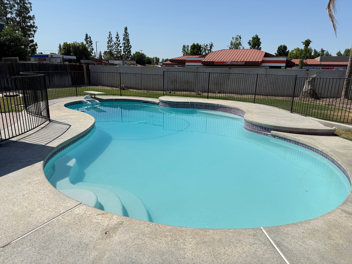Family friendly home with 3 bedrooms and 2 baths. The house features private parking, a backyard with a children's playground, grill, pool and a fire pit. Perfect for families who are looking for a time to relax and rest. Close distance to CSUB, a shopping center, and a grocery around the corner.
