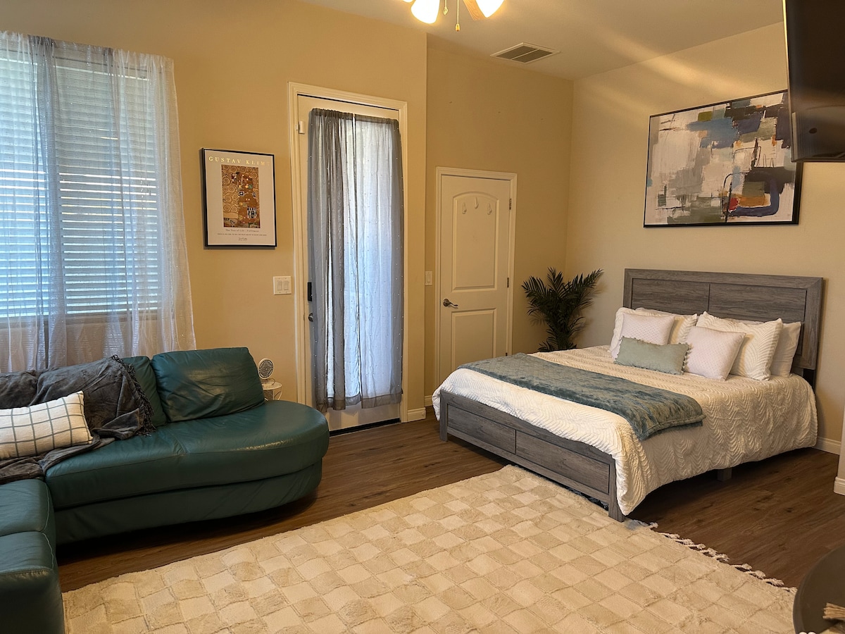 Relax and recharge in this serene 1-bedroom private suite — designed for comfort, calm, and convenience. Perfect for travel nurses, couples, or professionals seeking a quiet, boutique stay minutes from Hwy 99 and major employers. The Space This bright 1-bedroom suite located in Northwest Bakersfield blends hotel-clean standards with home-like warmth — featuring a plush queen bed with Bluetooth speaker headboard, high-speed Wi-Fi, and a separate living room for added space.