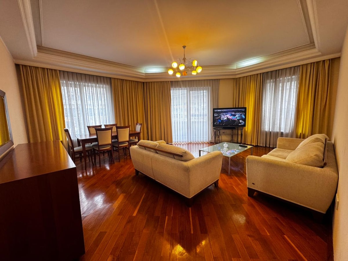 This 240-square-meter apartment offers luxurious living in the heart of the city. With three bedrooms and one living room, it is perfect for families or those who enjoy entertaining. Located in a prime central location, you'll be just steps away from Port Baku Mall, Crescent Mall, the Absheron Marriott Hotel, restaurants and shops.