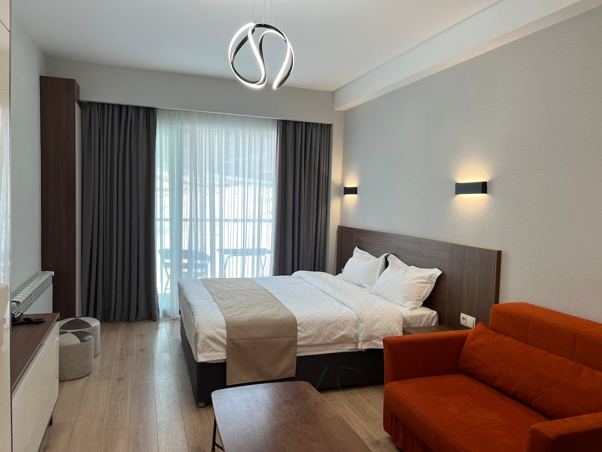🏔️ Crystal Residence, Bakuriani (Didveli) 🛏️ Accommodates 3 guests — a comfortable double bed and a sofa bed 🌅 Balcony with beautiful mountain and ski slope view 🛁 Modern bathroom and a cozy interior 🎿 Direct access to both Didveli and Crystal ski slopes (Ski-in/Ski-out) 🏊 Indoor heated pool, 🏋️ gym, 🍽️ restaurant, and 24/7 security 💫 Perfect for couples and friends seeking comfort and style within the Crystal hotel complex 🟢 Includes a Digital Guidebook with apartment tips