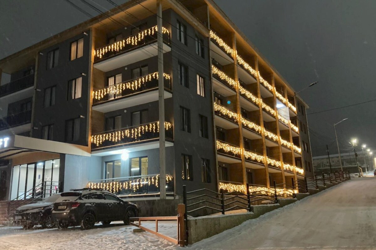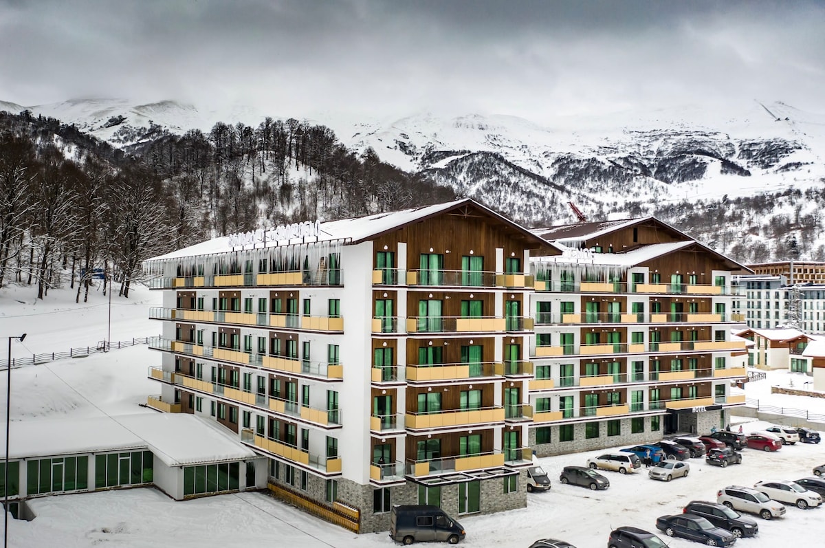 Warm and cozy Apartment for daily rent in ''Crystal Residence'' for maximum 4 people. 5th floor, with a view of Mountain Didveli. Crystal Residence is a premium Ski-In, Ski-Out hotel-type residential complex. the apartment is equipped with all necessary household items. From December 20, In the hotel there will be open: Indoor swimming pool, sauna, fitness gym, bar, and restaurant .