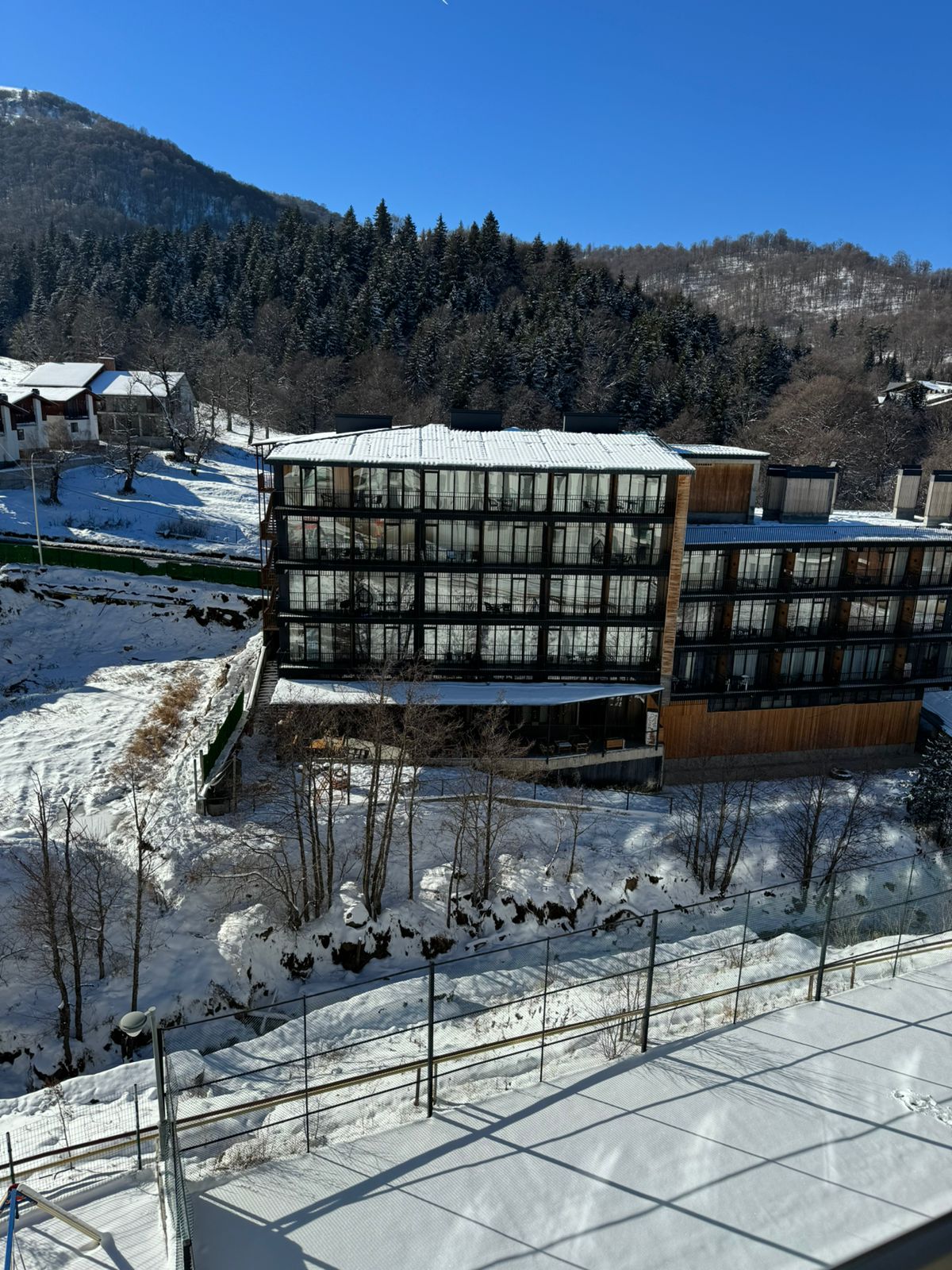 Отличное место расположение гостиницы. В 10 минутах от Дидвели. На территорий лыжная трасса, каток, детская площадка, стадион. Замечательный вид из окна.