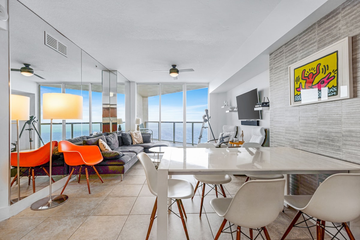 Modern and recently updated suite with 3 large bedrooms and 3 full bathrooms. Wrap around porch with spectacular, breathtaking, panoramic views of the ocean front from the 37th floor of the Lyfe Condominium. Great location, a 1 minute walk to the beach. A 30-min drive to Miami Airport or a 20 min ride to Fort L. Airport. The condo is comfortable and spacious, has 5 beds 1 king, 4 twin beds, a living room couch converts to sleep 2, has a fully equipped kitchen, TV in every room, and free WiFi.