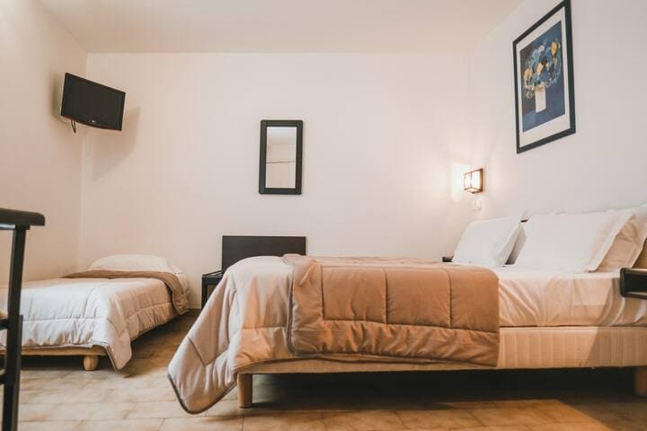 Studio pour 4 personnes équipé d'une cuisine aménagée (Frigo-congélateur, micro-ondes, plaque de cuisson, vaisselles, …) d'un coin salon avec TV LED 43" 4K et d'une salle de bain privative. Il se situe au 1er étage de l'hôtel le Colibri à Lucciana tout récemment rénové. L'hôtel propose le petit déjeuner (Boisson chaude, Tartines, Croissant et jus de fruit) pour 7.50€ par personnes. Des distributeurs de boissons chaudes et fraiches ainsi que de snacking sont disponible 24/24h.