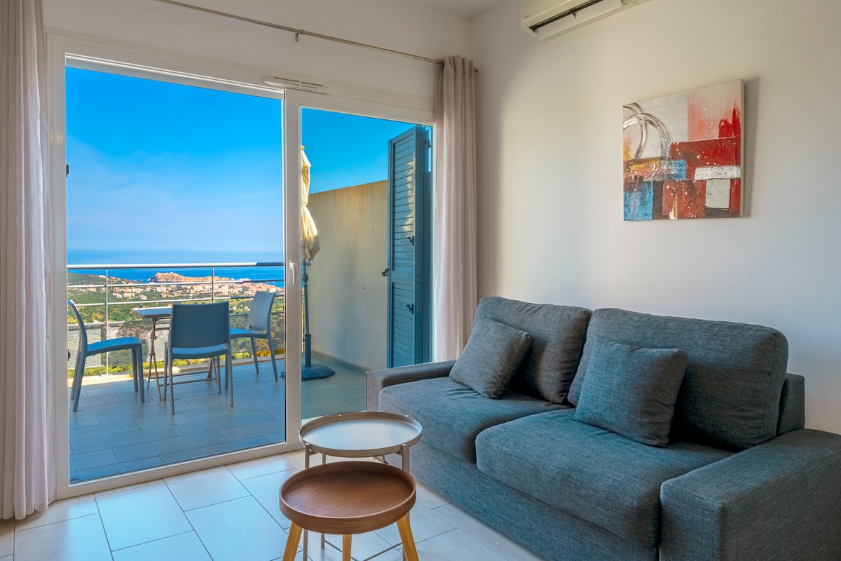17 Appartements au confort luxueux se partagent un domaine de près de deux hectare au dessus de L'Ile-Rousse, L'appartement dispose d'une Pièce à vivre avec un canapé-lit, une cuisine très équipée, deux chambre avec un lit en 160 et d'une salle de bain. Et pour profiter de tous les instants du bel été de Balagne, Le domaine possède une Piscine et un jacuzzi d'où le regard plonge jusqu'à la mer au-delà de la nature parfumée