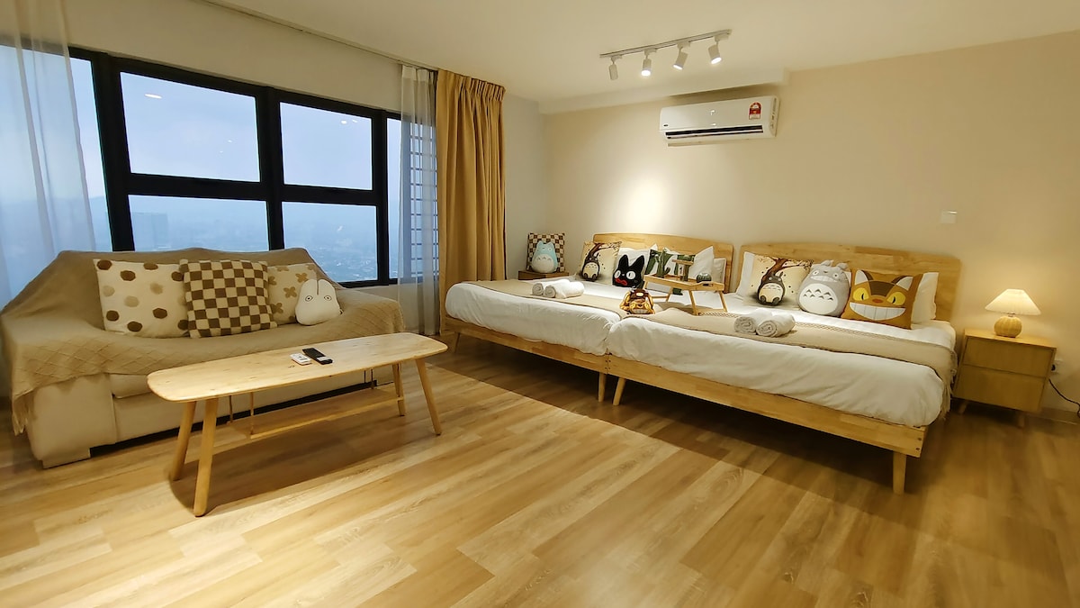 A cosy duplex on the highest floor of the building (Level 21), with a queen bed and a 3-seatersofa. Suitable for both short- and long-term stays. The building is in De Centrum Mall, with shops such as Super7 (supermarket), Tealive, Mr. DIY, SPP Bookstore and 7-Eleven among others, and facilities like launderettes and a clinic (Poliklinik MyMedik). •Check in time: from 3PM •Check out time: 12PM