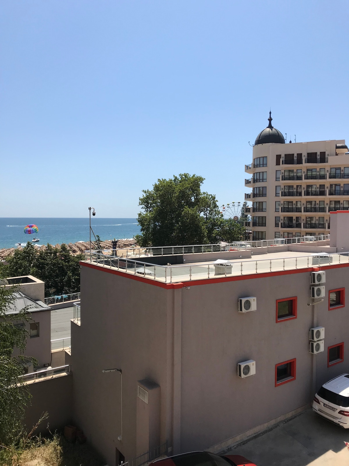 Golden Sands is a unique blend between nature and entertainment. Our apartment has great sea view from the two balconies and even when sitting down on the couch. Just 1 staircase to the beach, about 100 meter (or you can take the paved road). The direct environment is quiet and green. Guarded parking in front| Reception (24 hrs) | Italian restaurant || Cocktailbar | Two big swimming pools and kids pool | free sunbeds |Pool table| Fitness| Massages | a lot of restaurants along the beach