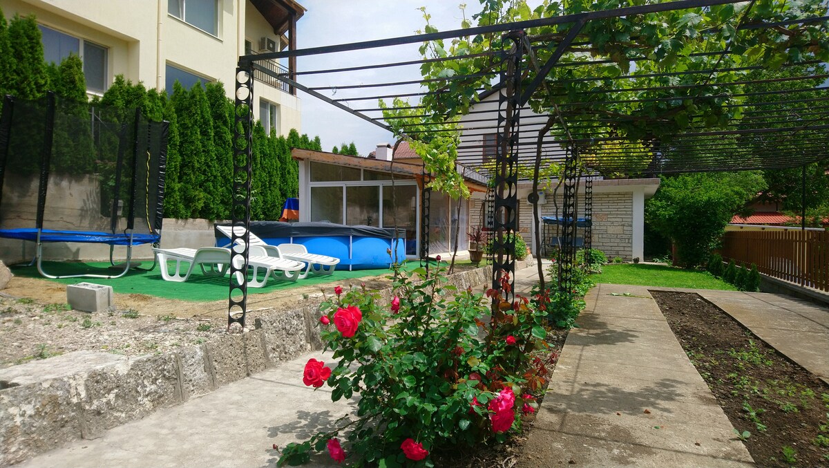 Sie sagen, dass Reisen das einzige ist, was man kauft und reicher wird. Lehne dich zurück und entspanne dich – in dieser ruhigen, stilvollen Unterkunft. Das Ferienhaus «La Villas H2» liegt 12 km von Zentrum der Stadt Varna, im Gelände «Manastirski Rid».Die Touristenresorts «Hl. Hl. Konstantin und Helena» und «Golden Strand» liegen nur 5 km entfernt. Das Haus bietet Ruhe undZurückgezogenheit im wunderbaren Hof mit Grünflächen,eigene Swimmingpool .
