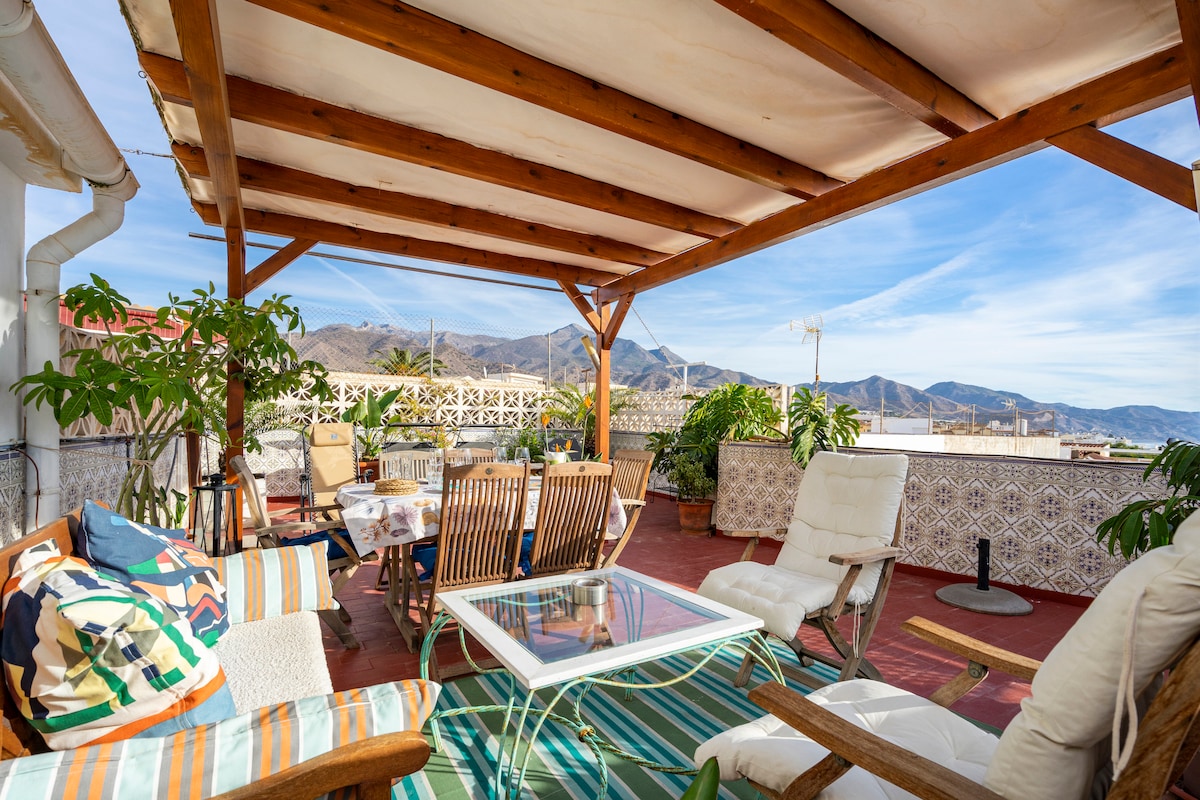 "Luxurious Penthouse 102 m2, including balconies 155 m2 with stunning views. In peace and quiet in the middle of the old town. Just 2 minutes walk from the Balcon de Europa and the 2 most beautiful beaches. Provides all the comfort and technical gadgets. All rooms with heating and air conditioning. Ozone sun, afternoon sun, BBQ, beautiful cacti and plants and ... a view to the mountains, the old village and of course the sea. Of course there’s WIFI and TV!"