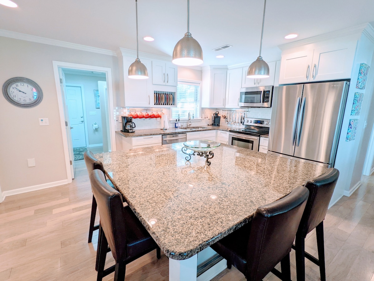 Newly renovated, refreshingly colorful, and fully stocked with everything you need for a rejuvenating stay at the beach. Lounge on comfy furniture, stream your favorite shows on large smart TVs, and unwind in a rocker on the brand-new screened-in porch. The spacious kitchen is equipped with new appliances, granite countertops, and all the essentials to enjoy a home-cooked meal with your crew. The home is located in the prime of the island just a 9-minute walk to an absolutely beautiful beach.