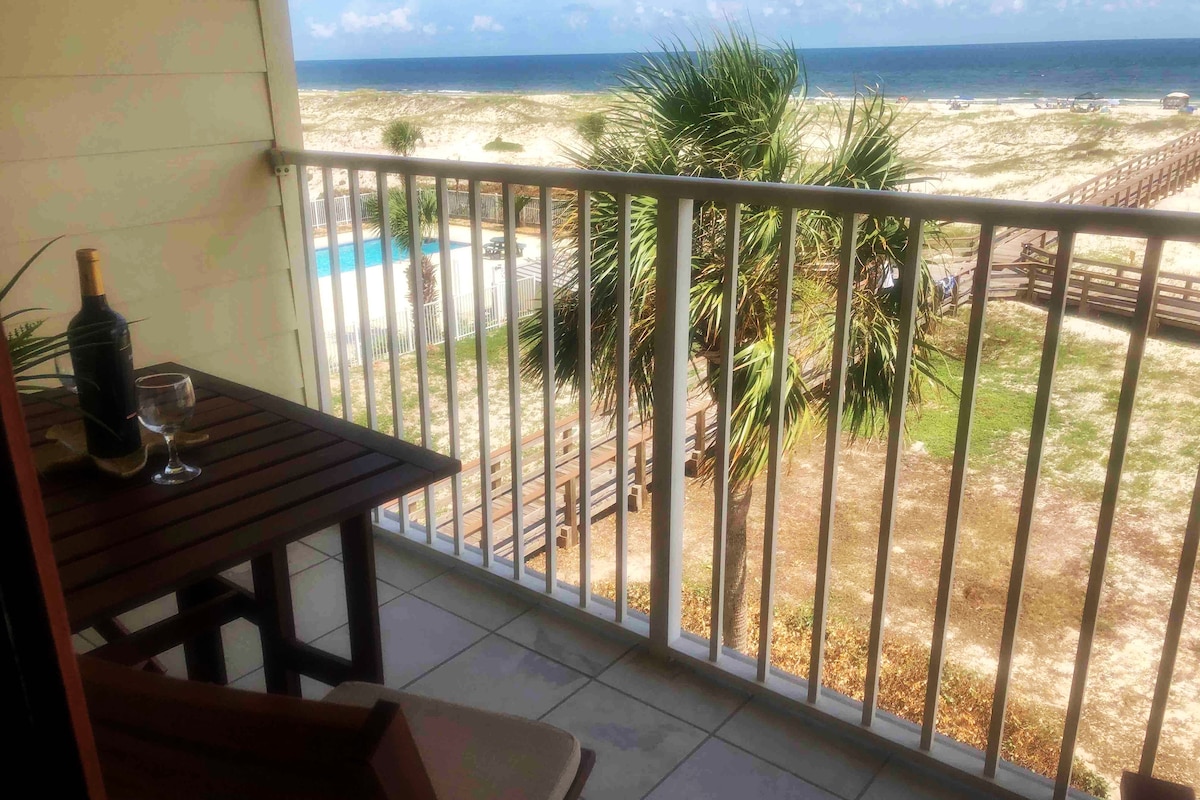 Retreat to this beautiful BEACHFRONT 1bd/1ba condo located in the beautiful Gulf Shores Plantation Resort steps away from the Gulf Of Mexico! Located in the quieter, more secluded part of Fort Morgan/Gulf Shores, but close enough to everything you need within 20 min. You will absolutely love everything about this condo, from the fun, beachy decor to the sounds of the ocean waves while sitting on the top (3rd) floor balcony. MAX 4 guests, but ideally perfect for couples or small families!