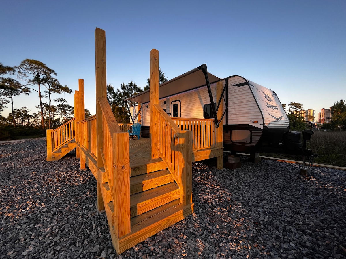 Comfortable Cozy Coastal Camper. You won’t forget your time in this memorable place. The Gulf of Mexico (Johnson's Beach) is 1.1 mile from your door. Historical Downtown Pensacola, Fla. is only 20 minutes away. Orange Beach and Gulf Shores are also within driving distance. There is a Marina with daily fishing charters just across the street, food trucks and multiple restaurants within walking distance or a short drive. Many places with local cuisine, drinks, and live music daily.