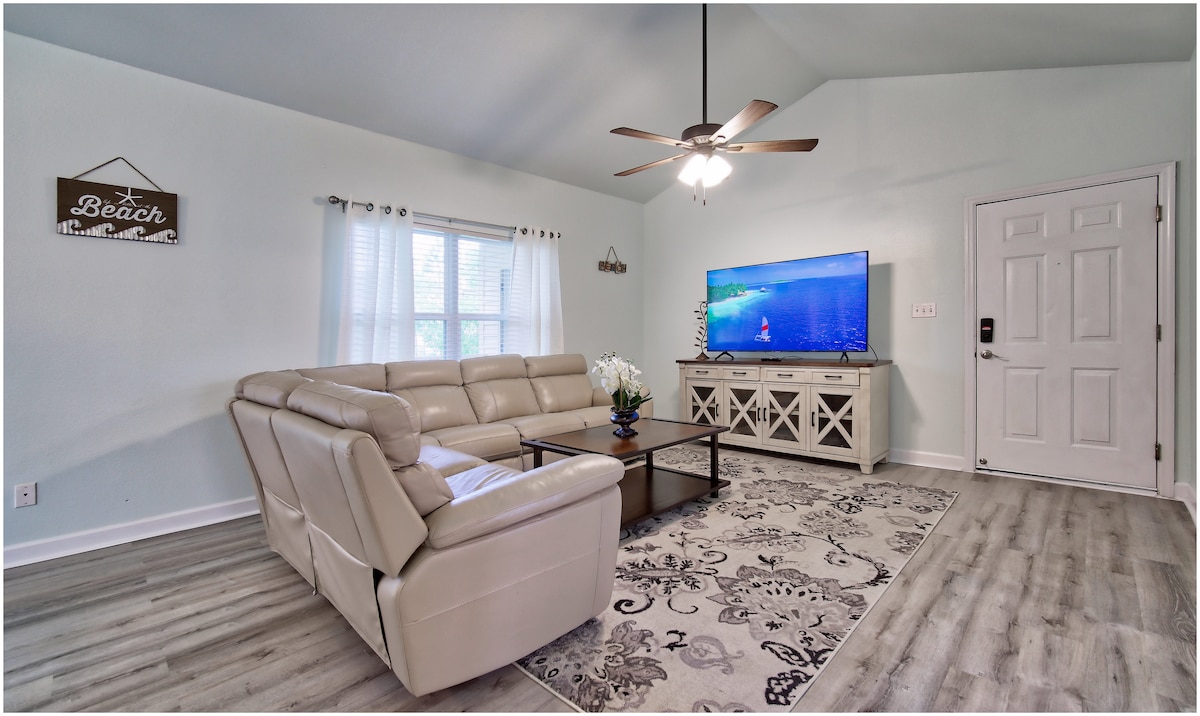 Unwind in a bright 4-bed, 2-bath home in Daphne with vaulted ceilings and coastal style, sleeps 10 guests. Prime spot: 5 min to I-10, 5 min to Mobile Bay ~ quick drives to beaches, Mobile & Fairhope. Enjoy the open living area, stocked kitchen and screened porch. King master + 3 queen rooms (2 queens in one) 5 beds ✔️Screened Porch ✔️4 Smart TVs ✔️ WiFi ✔️Washer/dryer & ample parking ✔️Quiet neighborhood Self-check-in, family friendly, smoke-free. Book Now!
