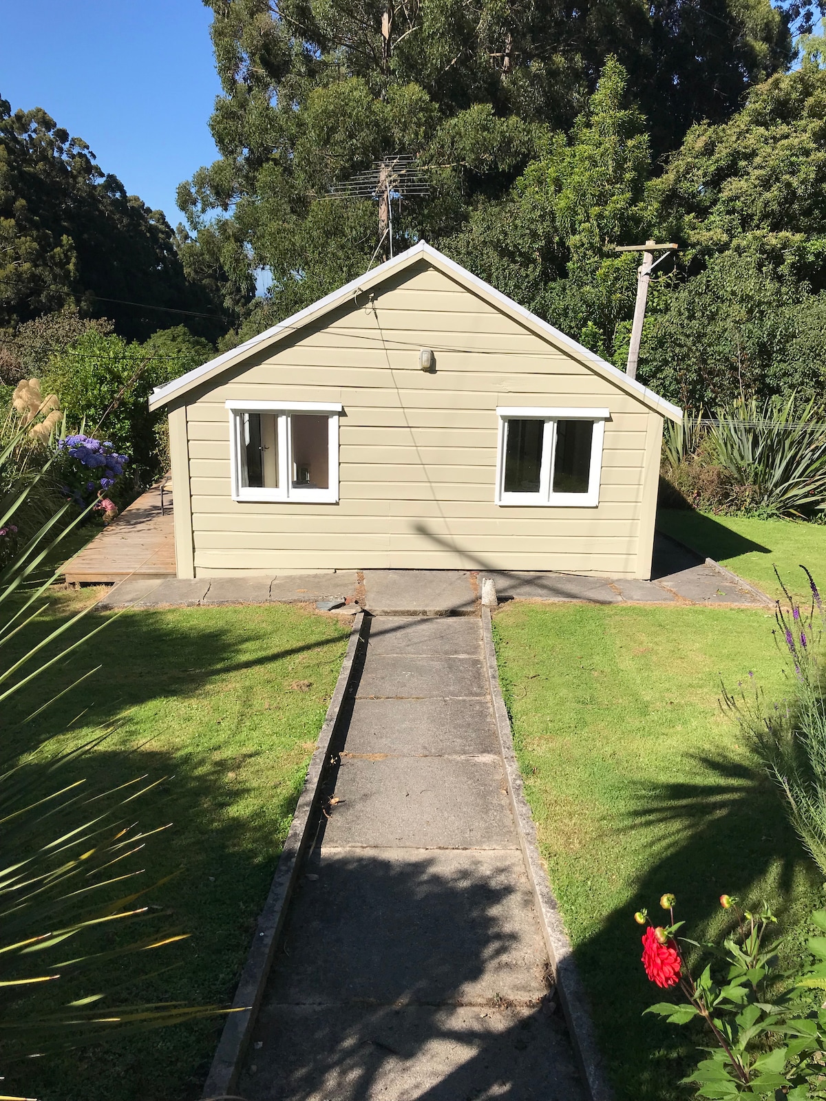 Welcome. My place is a quiet and secluded retreat, an easy ten minute drive from the centre of the city. Situated in a tree filled suburb at the beginning of the magnificent Otago Peninsula area. The annex is private from the main part of the house with its own entrance and suits one or two people. The garden is a work in progress, depending on the season, with a sheltered, sunny courtyard for your use. There is a small outlook over the harbour water, giving you a glimpse of the city and hills.
