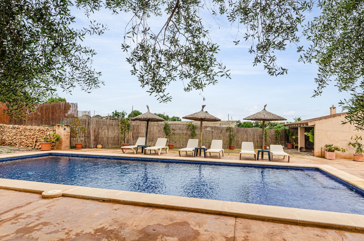 Finca rústica original, de más de 150 años de antigüedad, situada en el sur de Mallorca, entre dos preciosos pueblos: Ses Salines y Colonia de Sant Jordi., , Carretera dispone de carril para caminar, correr. Hay dos perritas pequeñas, gallinas, 1 gallo . Piscina de agua salada ideal para niños AIRE ACONDICIONDO DISPONIBLE: Sala de 14 a 22 hs aqui con intervalos de apagado cada 2 horas aproximadamente. Dormitorios de 20:30hs a 7:30hs. Si lo quieren las 24 horas se pagará 50€ la semana.