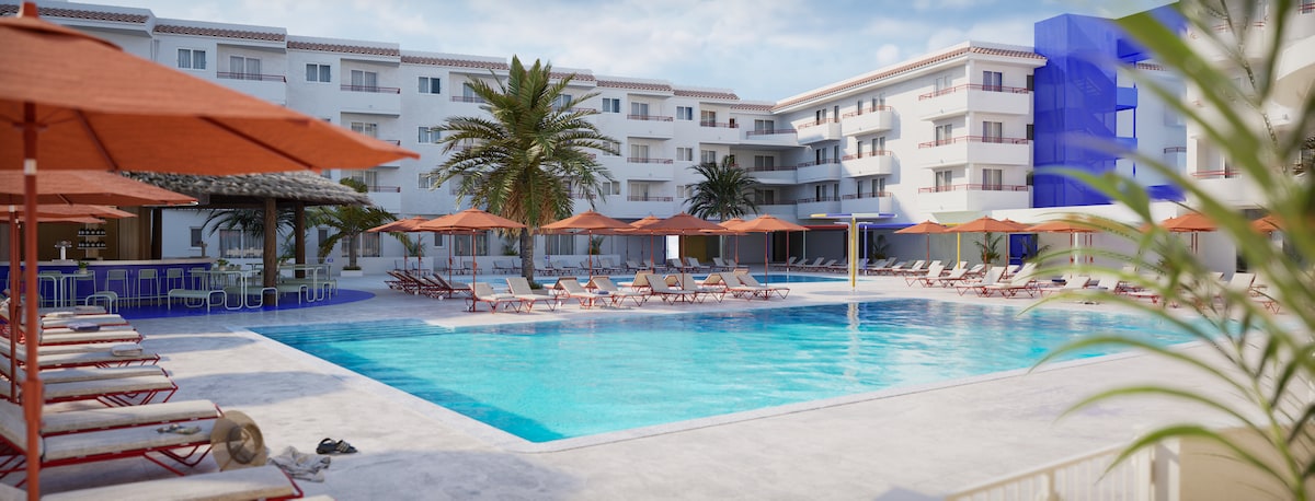 明亮的单间公寓,可俯瞰泳池,翻新酒店