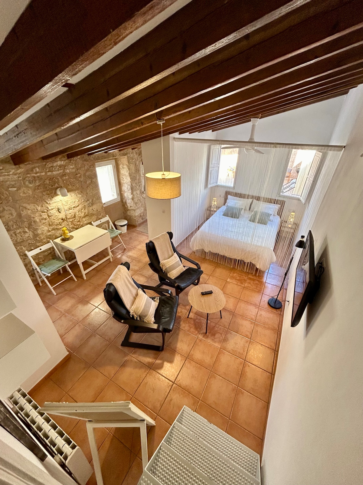 Beautiful loft for 2 people in the center of Palma and with street views. It has 2 single beds 90cm x 200cm, sofa, bathroom with shower and lift. In addition, equipped with kitchen, microwave oven, Nespresso coffee machine, mini refrigerator, hair dryer, free Wi-Fi, TV, sheets, towels, iron, dining table, air conditioning and heating. Guests have access to a large communal terrace with hammocks, and also a washer/dryer for guests.