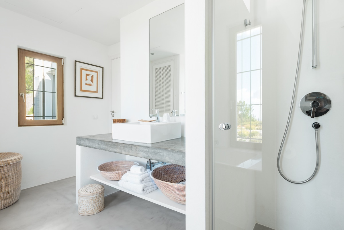 From outside, the villa looks like a traditional Ibiza country house, concealing the unexpected beauty that lies within. Upon entering, there is a Moroccan-riad-style patio with a gorgeous water feature draped with water lilies, giving you an immediate feeling of relaxation. From this patio, the rest of the house extends like a treasure trove of incredibly well-thought-out and beautifully decorated spaces. You can lie back in the sunken hot tub that feels as though it’s suspended in the trees for peaceful nights under the stars. Start your morning in the outdoor shower room with a view, or sink into the standalone oval bath in the en-suite bedroom in the main house. Eat breakfast or have pre-dinner aperitifs on the patio with built-in seating offering the perfect frame for the panoramic sea views. Get cosy in the TV room made up entirely of a built-in sofa filled with soft cushions that feel like a warm embrace. Next to the pool, and within the blissful, lushly planted terraced gardens, there is an outdoor fully-equipped kitchen with stylish light features and a custom-built table for convivial al fresco dining as you watch sky streak with incredible colours over the sea at sundown. Every feature of the villa has been carefully selected for utmost comfort and with incredibly good taste. High-end and hand-picked décor items honour and respect the original features and authentic style of Ibiza and offer the perfect marriage between premium style and home comforts. This is a truly exceptional property, one designed to be enjoyed and a real hidden gem in Ibiza. Copyright © Luxury Retreats. All rights reserved. BEDROOM & BATHROOM • Bedroom 1 - Primary: King size bed, Ensuite bathroom with stand-alone shower and bathtub, • Bedroom 2: King size bed, Ensuite bathroom with stand-alone shower • Bedroom 3: King size bed, Ensuite bathroom with stand-alone shower, Terrace • Bedroom 4: Queen size bed, Ensuite bathroom with stand-alone shower, Terrace Guest House • Bedroom 5: King size bed, 2 Twin size beds (can be converted to a king), Ensuite bathroom with stand-alone shower OUTDOOR FEATURES • Terrace STAFF & SERVICES Included: • Linen change - weekly • More under “Add-on services” below Extra Cost (advance notice may be required): • Activities and excursions