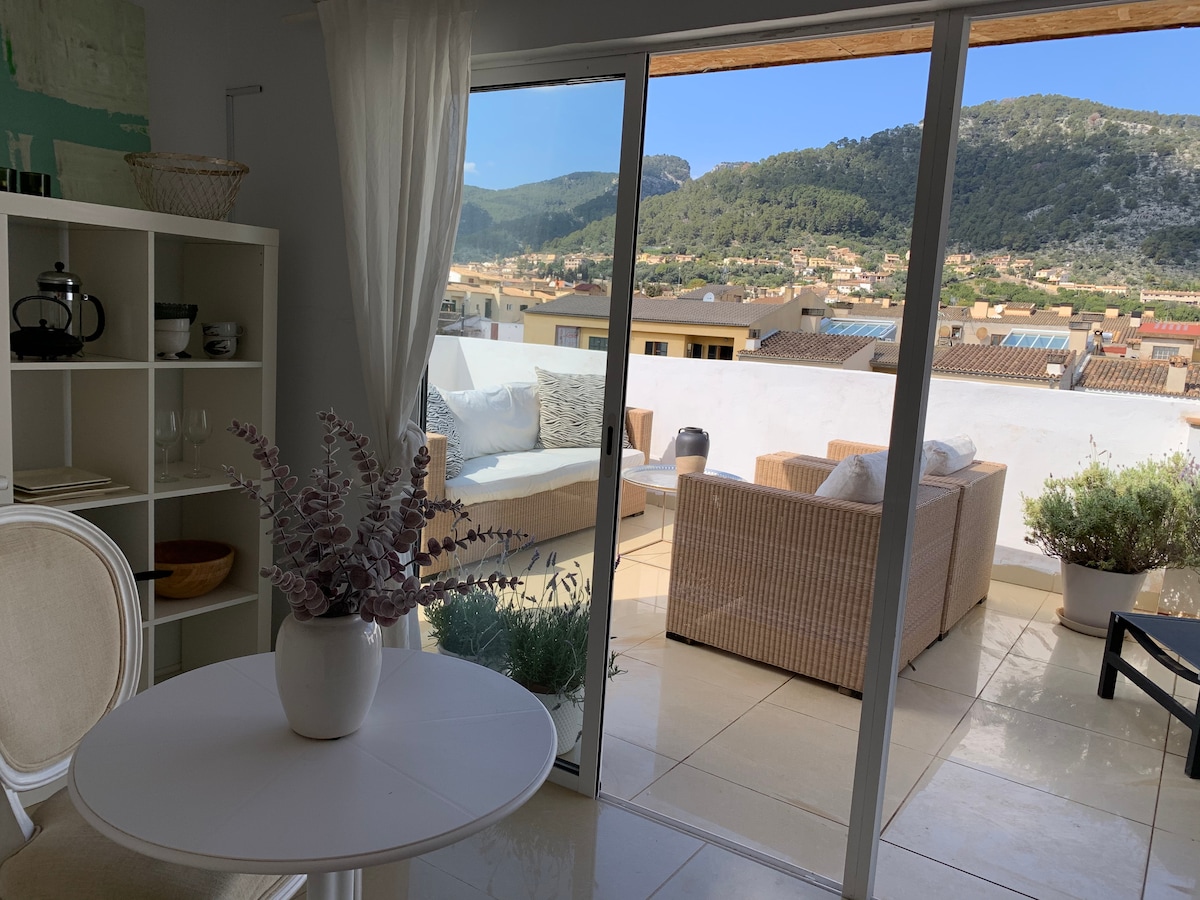 Stylish penthous studio with outstanding view over the village and mountains of Alaro. Totally private, with private entrence. Free parking in the street. 30kmv studio with king size bed, pentry kitchen and bathroom. 25 kvm roof terrace, totaly furnished and with spectacular view over the mountains and village. The apartment is equipped with coffemaschine, microwaveoven, fridge, cups, plates etc.... Everything you need for making breakfast or a light meal.