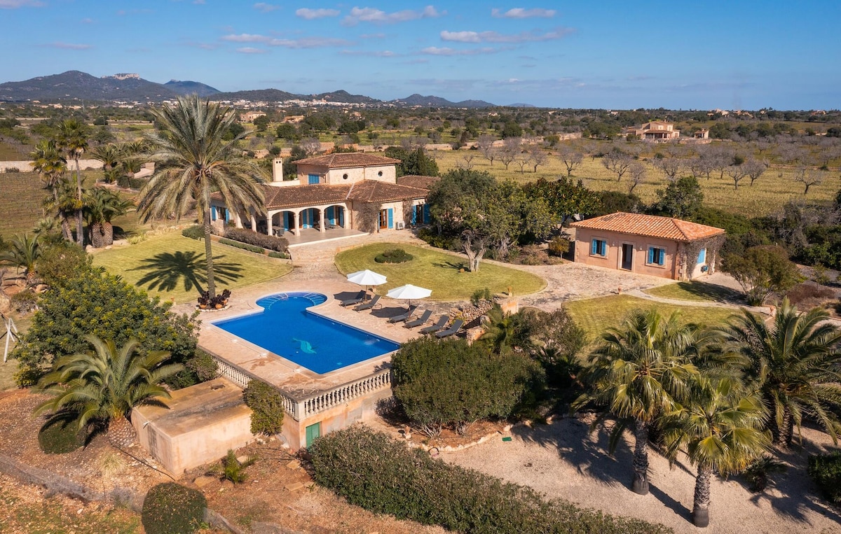 Wundervoller Ausblick, Garten und totale Ruhe! In diesem kleinen Haus auf einem mehr als 15.000 qm großen Grundstück kann man das mediterrane Leben genießen mit Sonne, Garten, vielen Terrassen, Licht u unglaublich schönem Garten. Ruhe kann man hier hören!! Alles ist mit viel Liebe und Geschmack eingerichtet, der Garten ist angelegt mit Wein, Olivenbäumen, Granatäpfeln, Rosen - u Kakteen, Blauregen- man wird verzaubert…mit tollen Sonnenaufgängen u Weitblick von Manacor bis Villafranca