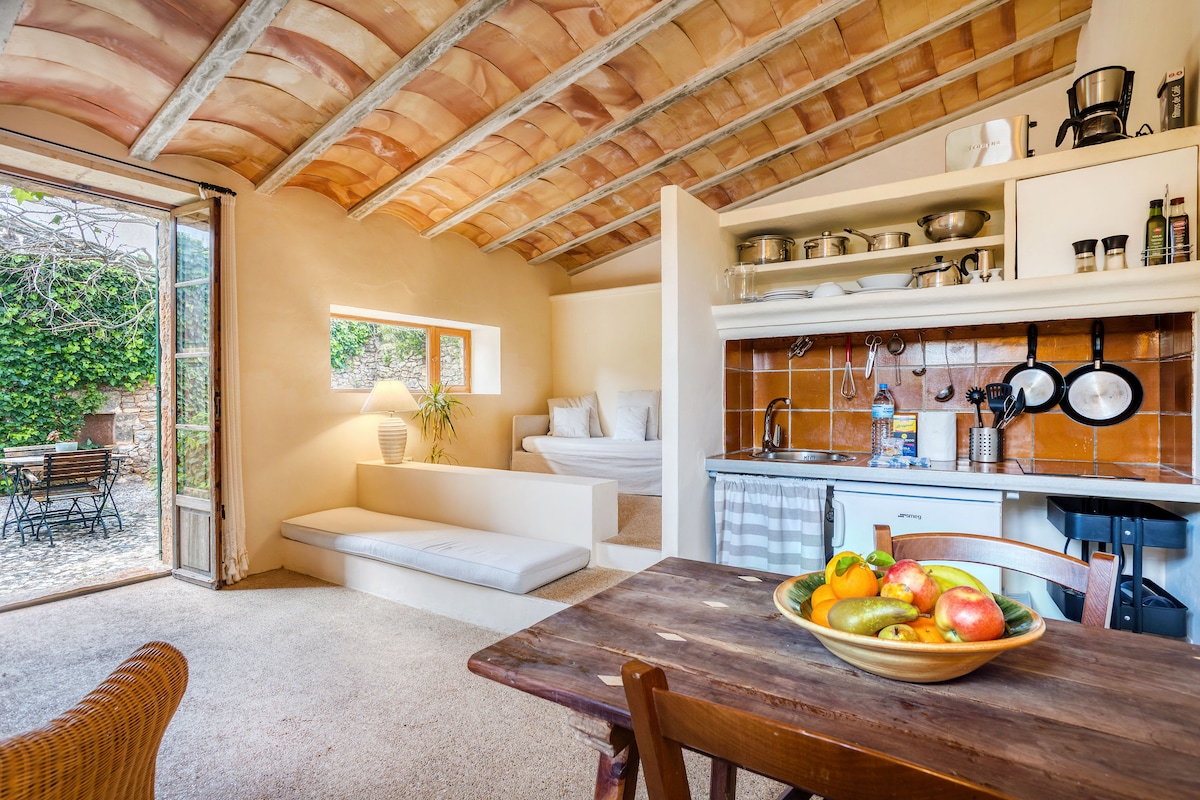 2 km outside the small village of Es Llombards/ Santanyi lies this small cosy finca for 2 persons. With a large living-dining room with kitchenette, a bedroom and a bathroom with shower, 2 people and toddler can spend a wonderful, peaceful holiday here. The outdoor area with plenty of seating and lounging options as well as sun and shade areas and an outdoor retro bathtub round off the comfort of the finca.