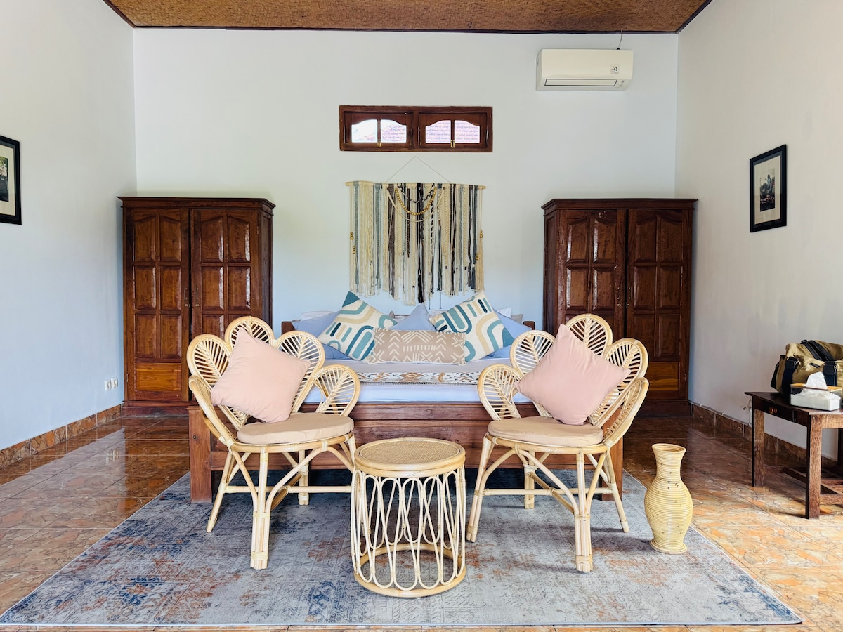 Stay in the heart of Bingin with this spacious room. Features patio area plus pool side lounge area, the perfect place to relax and unwind. Your room includes a private bathroom, king size bed, AC, daybed (which can be made up into a second bed for an additional charge), mini fridge, kettle, outside seating as well as a poolside sitting area. This listing is for the downstairs room only. The upstairs cottage is rented separately. Note this room is located roadside so subject to street noise.