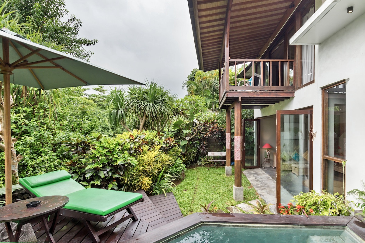 Beautiful private one Bedroom villa with 6x3 meter pool. secure ,private,safe. lush garden and sheltered but open kitchen for dining and relaxing by the pool. queen bed,bath room open shower, fully equipped kitchen. ac,tv, great wifi, daily cleaning and set breakfast is including. in a lovely village call Penestanan Kaja. It is only 2 km away from Ubud center.