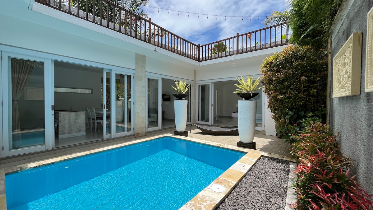 Embrace the Balinese charm of this tropical escape. Villa Wahah features an all-white color scheme contrasted by warm woods, flowing indoor-to-outdoor living spaces, and a tropical garden terrace. Strategic location, nearby walking spots, - 1 Min to Eat Street - 7 Mins to La Favela - 5 Mins to Revolver Espresso Cafe - 5 Min to Seminyak Village Mall - 10Min to Petitenget Beach Each bedroom has its own ensuite, so you can freshen up in privacy. Both rooms open directly onto the pool.