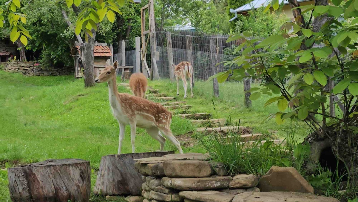 Nestled in a 15,000 sqm private garden, our charming country cottage features three separate houses with four bedrooms, a cozy living room, a fully equipped kitchen, barbecue area, and private bathrooms in each house for added comfort. Decorated in authentic Transylvanian style, it offers a peaceful retreat where deer and other wildlife often roam freely in the yard. Ideally located between Transylvania and Muntenia, with easy access to Bran, Brașov, Sinaia, and southern Romania.