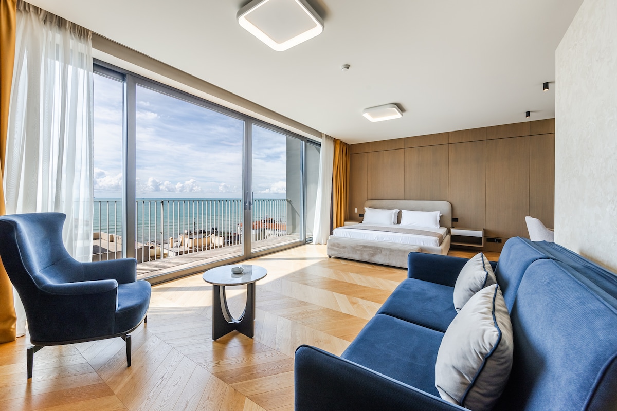 Enjoy a relaxing all-inclusive seaside stay at Durres Bay in Shkëmbi i Kavajës. Your stay includes breakfast, lunch, dinner, unlimited drinks, and full access to all hotel pools. Located near the Adriatic coastline, this suite is perfect for beach holidays in Durrës.This elegant Superior Suite with Seaview offers the perfect setting for couples, families, or travelers looking for a relaxing escape on the Albanian Riviera.
