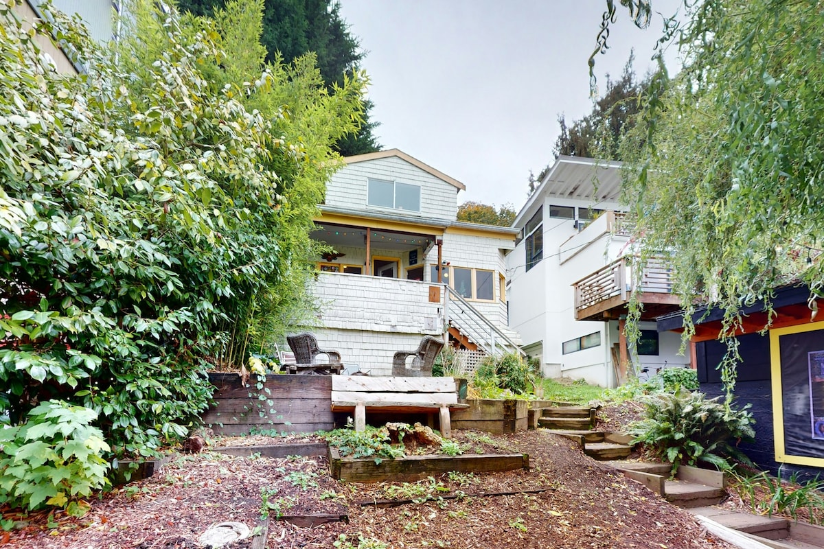 WINTER SPECIAL! Come enjoy the best of both worlds: our 2-story garden cottage is tucked within Seattle’s quiet and lovely Madrona neighborhood, graced by evergreens & a view of Lake Washington and the Cascade Mountains to the east. Yet it’s less than 2 miles west of downtown & 1.5 miles from the vibrant Capitol Hill neighborhood, both easily accessible by 2 bus lines. **Please note that the alternate tread stairs are not appropriate for children, animals, or people with reduced mobility.**
