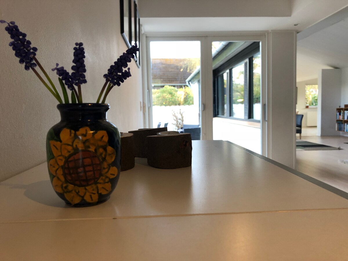 Welcome to our 180sqm modern house from 2018 with all the latest features and amenities. Garden with wooden terace facing South-West where you can enjoy the sun from noon until sunset facing a private pond - see pictures. Relax and enjoy your stay with pleanty of room in modern and calm surroundings only 15 min driving from Copenhagen.