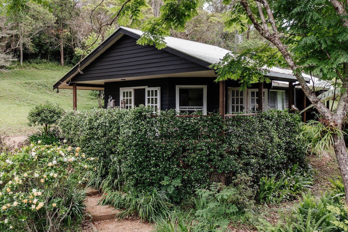 Tranquil garden cottage. Short drive from the historic village of Newrybar, 15min from Bangalow and Lennox Head's beaches and just 25min to Byron Bay. We are Pet friendly! Open plan living, modern kitchen and a unique bathroom, all with large windows that bring the outdoors in. A covered deck deck bathes in sunshine + looks across the garden you share with rescue hens who lay fresh eggs for breakfast! Doors open directly from the bedroom to a 2nd deck shaded by the canopy of a Poinciana tree