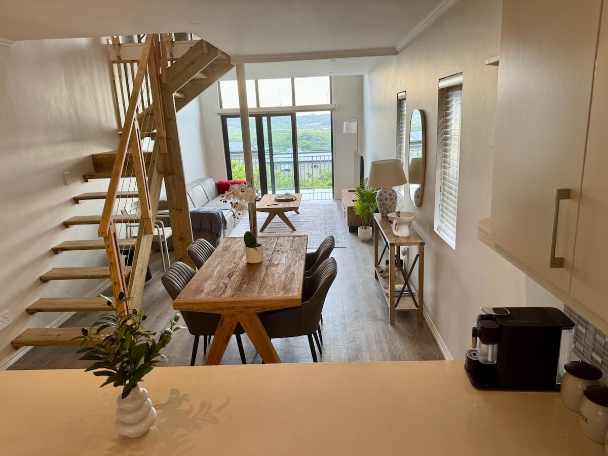 Experience an amazing ocean sunrise from this indoor/outdoor, spacious, light & breezy self-catering loft apartment with breathtaking sea views. Situated in the renowned Simbithi Eco Estate, Ballito, you can escape to nature while exploring forest walks, cycling trails & dams as well as 3 swimming pools. Beach is only 3min away! Communal BBQ. Sleeps 3 adults & 1 child on the shared upstairs loft. En-suite bathroom, aircon, wifi, full DSTV, large shower. Self-check-in. Now with power back-up!