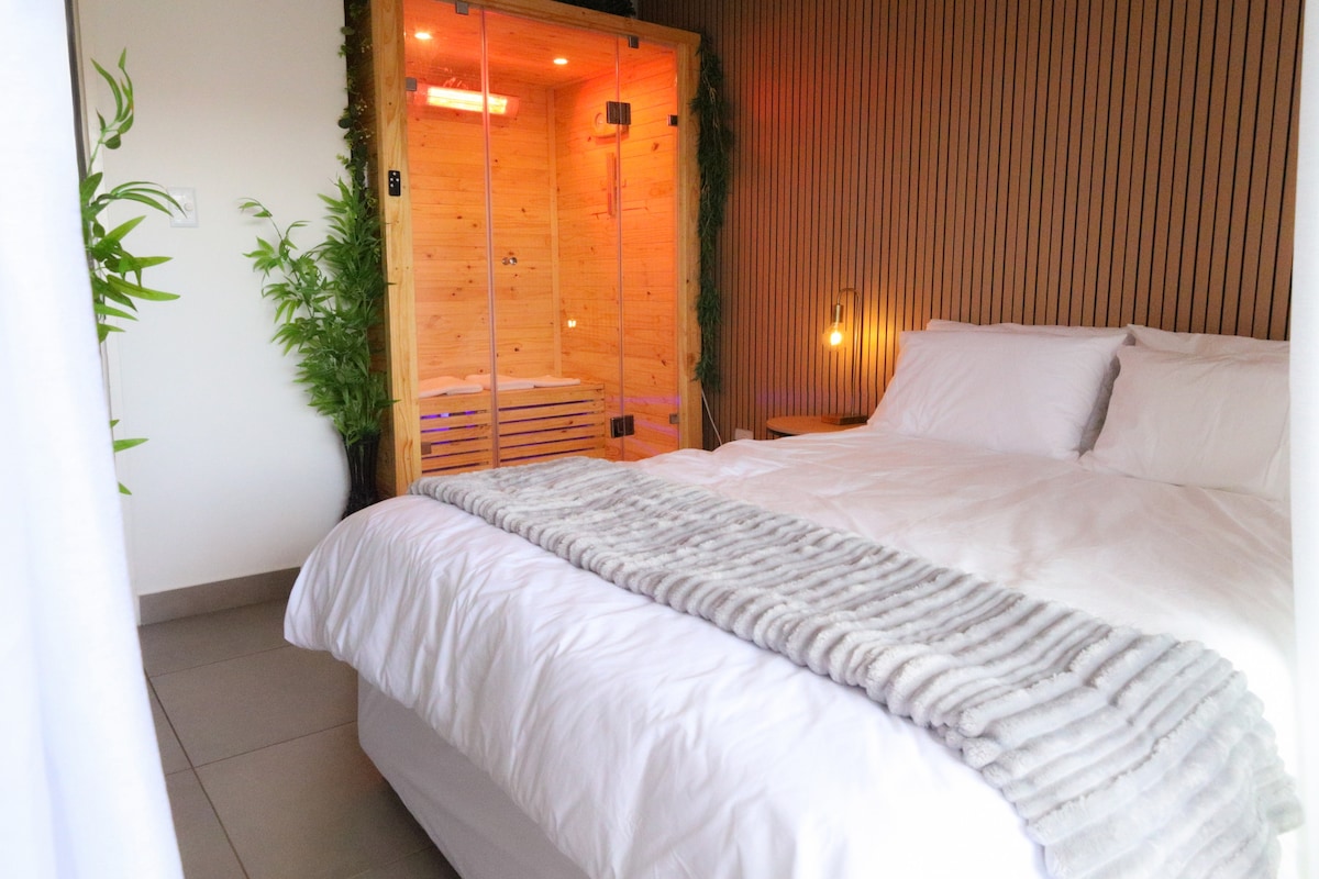 Your Romantic Escape in Ballito Village, Unwind in this stylish one-bedroom apartment designed for couples. Enjoy your private sauna, spacious bathtub, Wi-Fi & Netflix, and a fully equipped kitchen. Relax by the estate’s pool, gym, or dine at the on-site restaurant. Just 3 min from the beach, Ballito Junction, and Lifestyle Centre — 15 min from the airport. Perfect for a relaxing or romantic getaway!