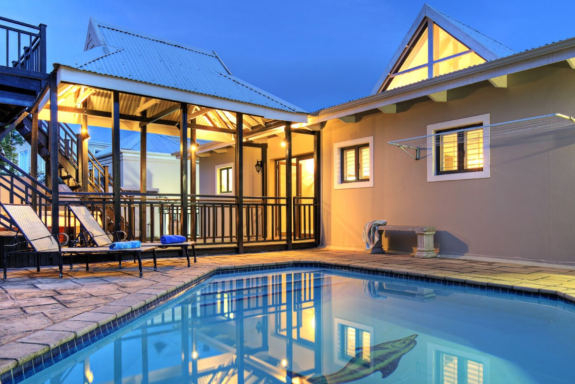 This fully serviced lodge in Simbithi Eco Estate, Ballito, SOLAR powered and offers the comfort of four lower-ground en-suite bedrooms, a lounge, a state-of-the-art kitchen and family room, a dining room, an outdoor pool, a dining area, and inviting sofas. On the edge of an indigenous forest, within easy reach of shops and beaches. Discover Ballito, tucked between the lush rolling hills of the KwaZulu-Natal North Coast and the waves of the Indian Ocean, just 20 minutes from King Shaka Airport.