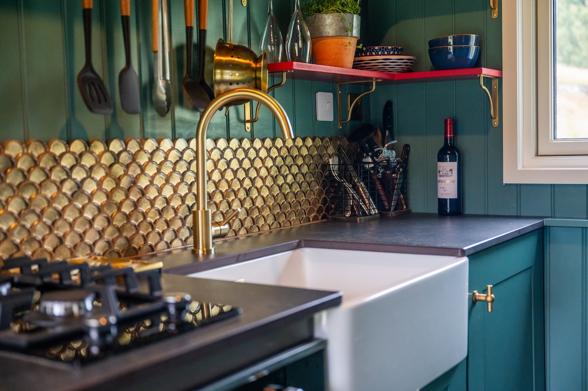 Below a pond and tucked behind a hedgerow on the edge of a permaculture smallholding, our charming shepherds hut is the perfect hideaway for those looking for an eco farm stay or self-made retreat. 'Muggans' (named after the Mugwort that grows by the steps) is entirely off-grid and has everything you'll need for a comfortable and memorable getaway, including a wood burning stove to keep you cozy, a wood fired hot tub to soak in under the stars and pizza oven for luxury campfire cooking.