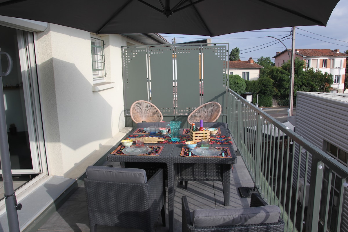Appartement très lumineux jusqu'à 9 couchages maximum au 1er étage d'une maison avec un très grand parking pour plusieurs véhicules ou engins de chantier. Possibilité de profiter d'une partie du jardin avec table, chaises et barbecue. Situé à seulement 5 minutes en voiture ou 5 minutes à pieds du Métro Balma Gramont et du centre commercial Auchan. Par le métro, en 10 minutes et pour 2 € vous êtes place du Capitole (6 stations) ! au coeur de Toulouse. L’appartement a une entrée indépendante.