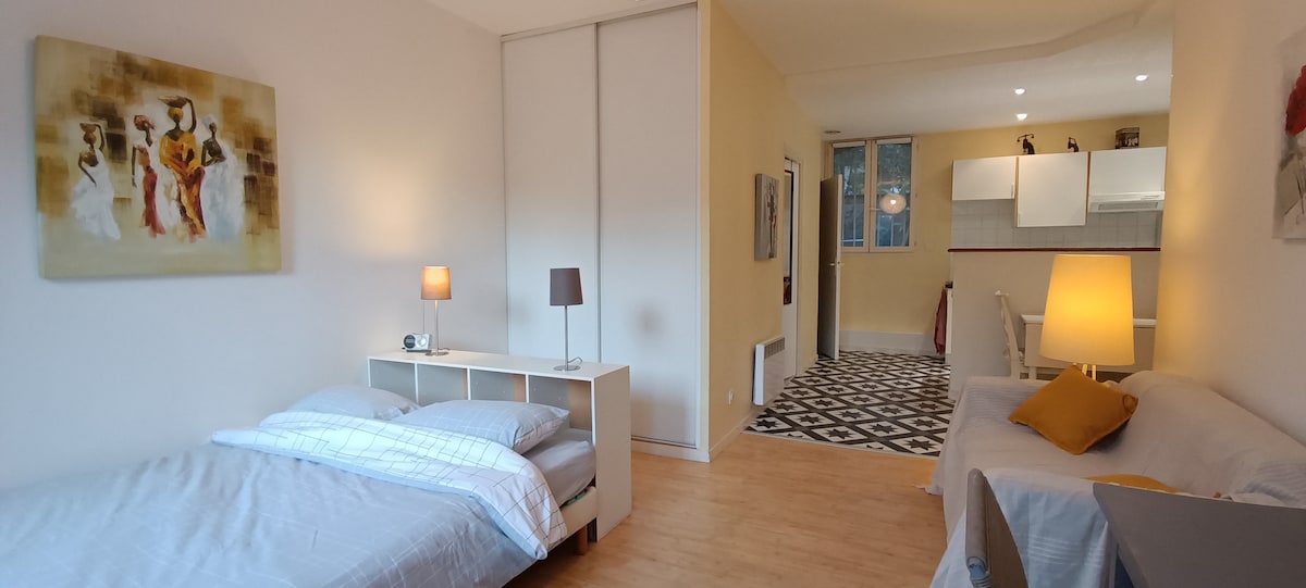 calme et élégant, petit studio indépendant dans jardin de maison de ville. Style mini maison indépendante Tiny house. Bien équipé. Canapé convertible avec literie de qualité pour couchages quotidiens . Sommier à lattes et matelas 45kg/m3. Salle d’eau coquette. Rangements. Cuisinette équipée, micro-onde grill, lave linge, mini lave vaisselle, petit électroménager à disposition. Parking pour petite voiture. Espace terrasse extérieure avec table, chaises et fauteuils pour se détendre