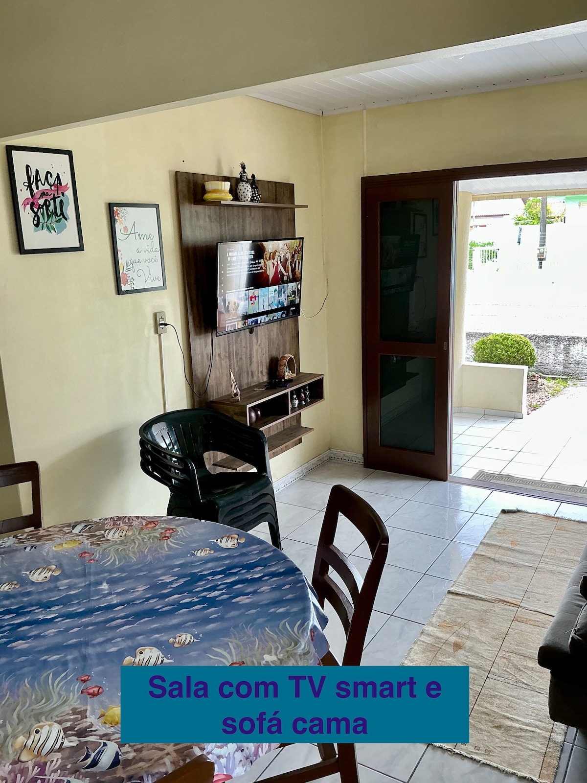 Ampla casa no centro da cidade, com 146 m², sala com TV smart, internet de 300 Mbps, ar condicionado, ventiladores em todos os cômodos, três quartos, cozinha, área de serviço e churrasqueira. São dois quartos de casal, um de solteiro e um sofá-cama, além de dois banheiros e chuveiro externo. Totalmente mobiliada com tudo para o dia a dia. Sala de jogos com mesa de sinuca, mesa de jantar, rede para descanso e chaise. Amplo pátio fechado para até três carros.